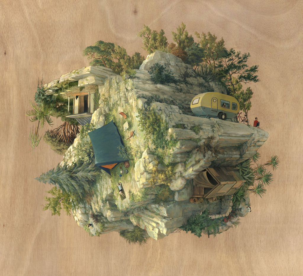 スペインバルセロナを拠点に活動する芸術家・アーティストである チンダ・ヴィダル (Cinta Vidalby Agulló) による絵画アート。木製パネルにアクリルで色付けをする。視点が交差するカプセル化されたシーンを作成するために、非重力構造の世界を構築する、錯視的な絵画だ。