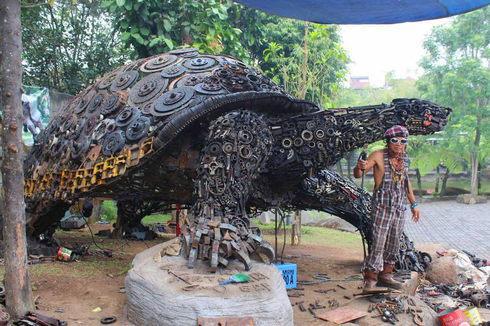 ノッシリとした重量感、大迫力の貫禄。産業廃棄された屑鉄・スクラップの金属部品を溶接して作られた巨大なカメ(亀)の彫刻。